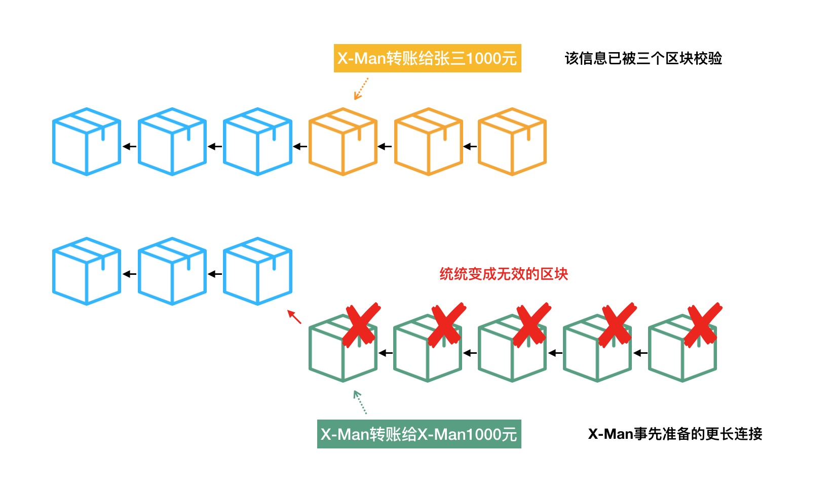 大功告成,X-Man拥有了一条更长的区块链条,那些较短、存放着“X-Man转账给张三1000元”的区块链,以及在区块链世界里那则真实转账行为被一同成功销毁。(?)